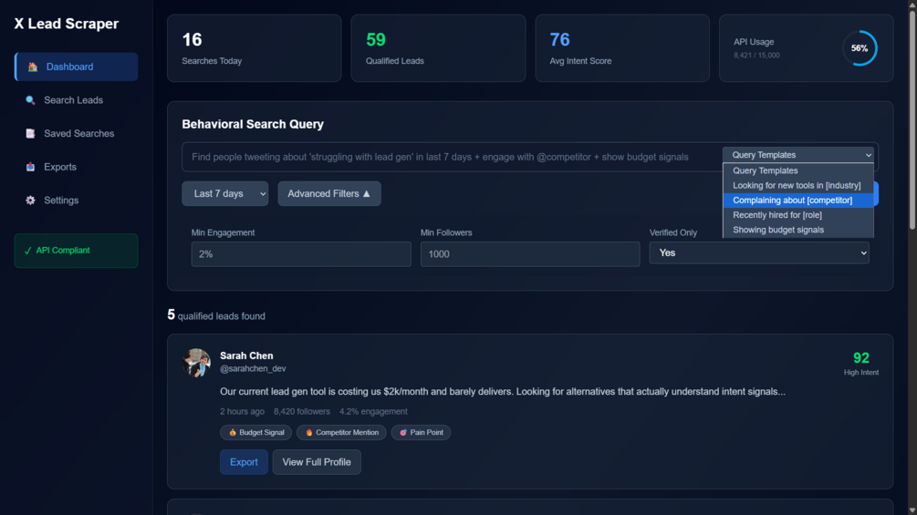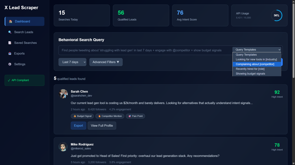 X Lead Scraper finds people actively looking for what you sell—based on what they tweet, not what their LinkedIn says.